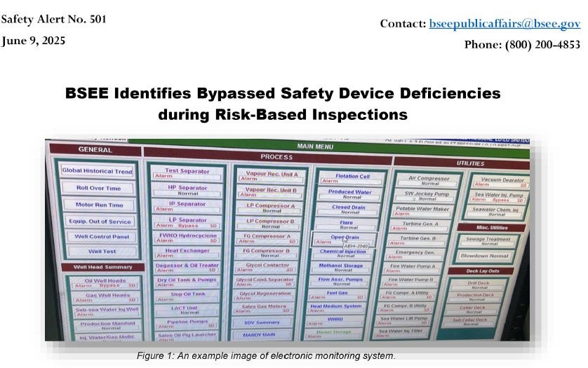 In order to illustrate the importance of expertise when creating a prompt I selected a recent Bureau of Safety and Environmental Enforcement (BSEE) Safety Alert #501. It is to do with problems with bypassed safety devices.