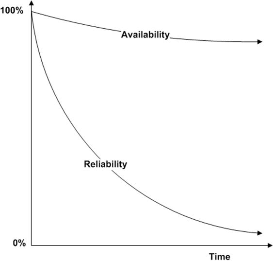 Over a long period of time availability levels out at (usually) quite a high number. This is because unreliable equipment items are either repaired or replaced. For example, the availability of a process unit may be say 95%, which means that it is operating 95% of the time. The reliability values for individual equipment items, however, trend asymptotically to zero. If an item is in service long enough, and if it is neither repaired nor replaced, it will eventually fail.